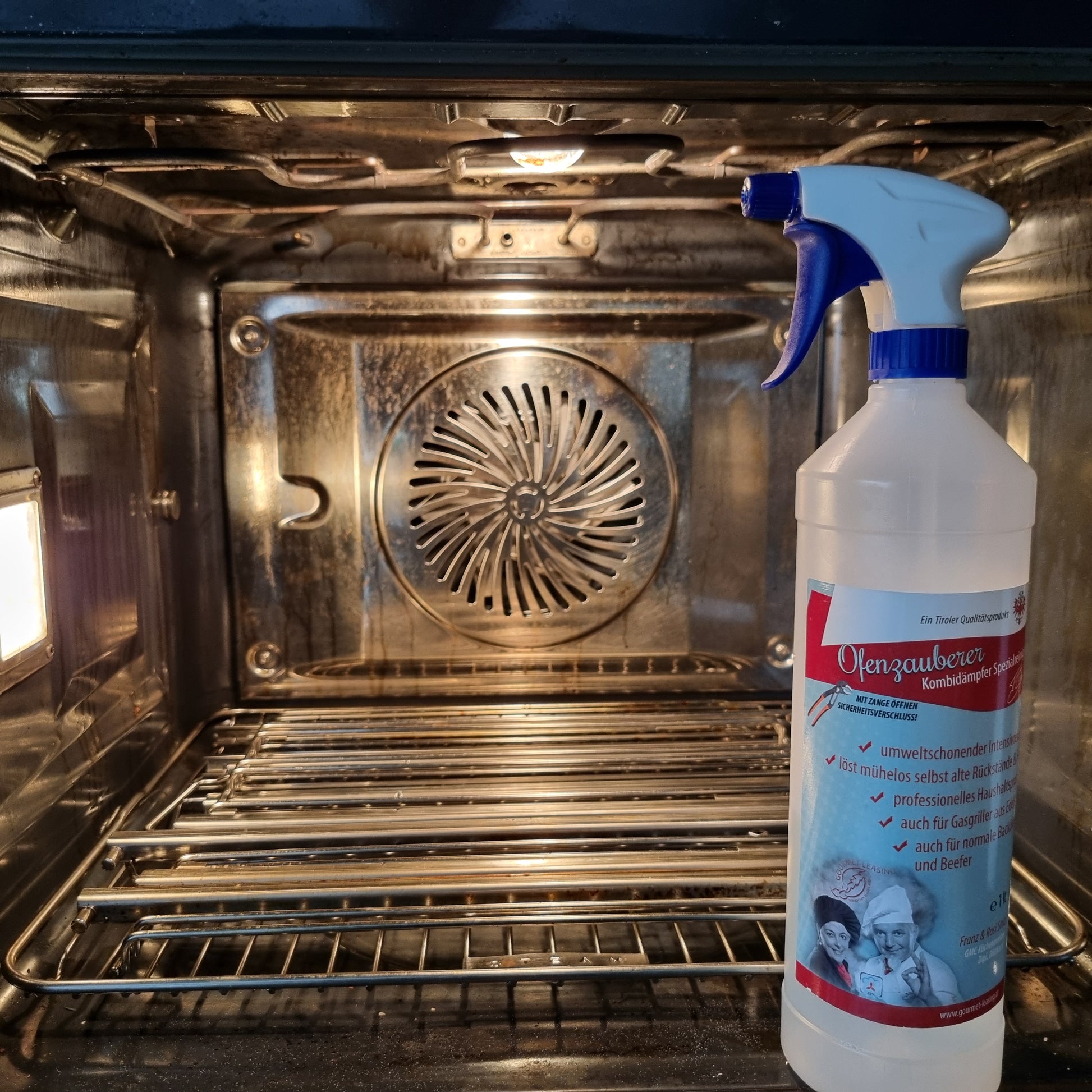 - Ofenzauberer in den Garraum sprühen Boden, Wände, Decke Rückwand, Lüfterrad im normalen Backofen nicht einsprühen